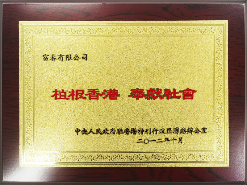 2012年10月中央人民政府駐香港聯絡辦公室授予富春有限公司“植根香港 奉獻社會”先進集體。