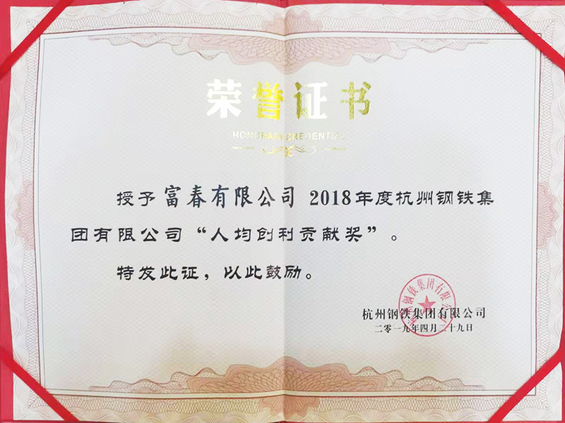 2019年5月杭鋼集團授予“2018年度人均創利貢獻獎”榮譽稱号。