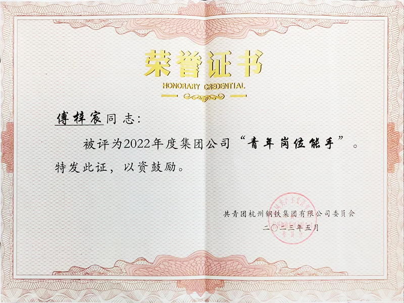 2023.5 傅梓宸榮獲集團公司“2022年青年崗位能手”表彰